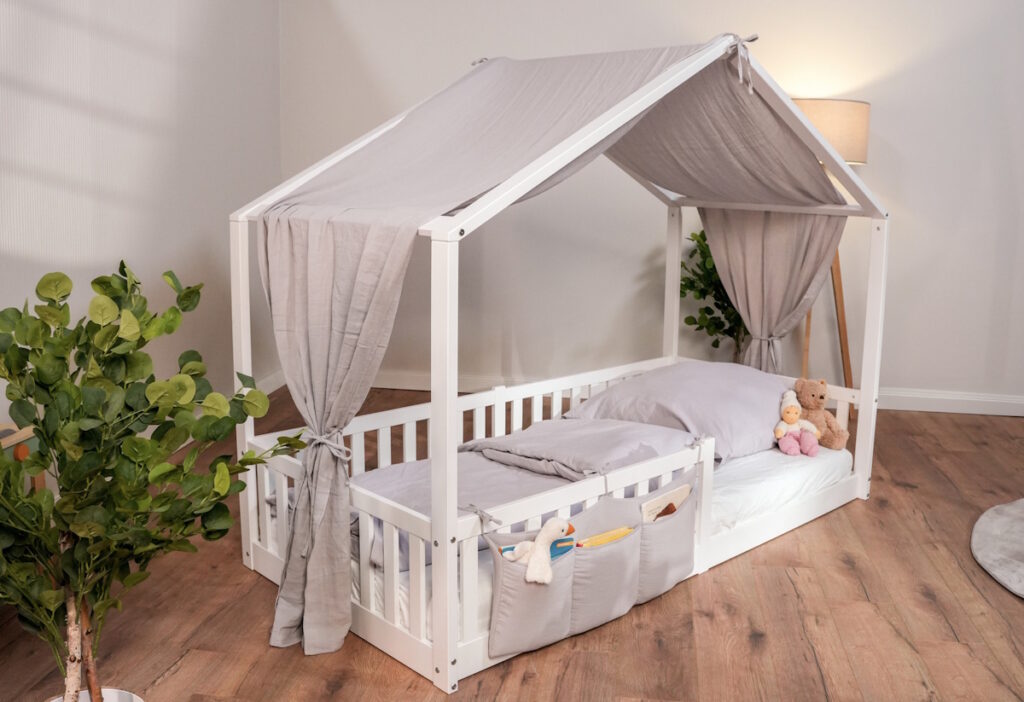 Vores gulvsenge er produceret i massiv bøg natur og i massiv bøg hvid lak. Det massive gør sengene særligt holdbare og stabile – et reelt alternativ til mange konkurrencedygtige produkter. Sengene inkluderer lamelbunde og består af to pakker. Sengene leveres i to udgaver: 90 x 200 cm og 140 x 200 cm. Hver seng leveres med baldakin – kunden bestemmer selv, om denne skal monteres eller ej. Der tilbydes smukke baldakiner og organiser i fem forskellige farver. – Produceret i Muslin – en type bomuldsstof, der er kendt for sin lette og bløde tekstur.